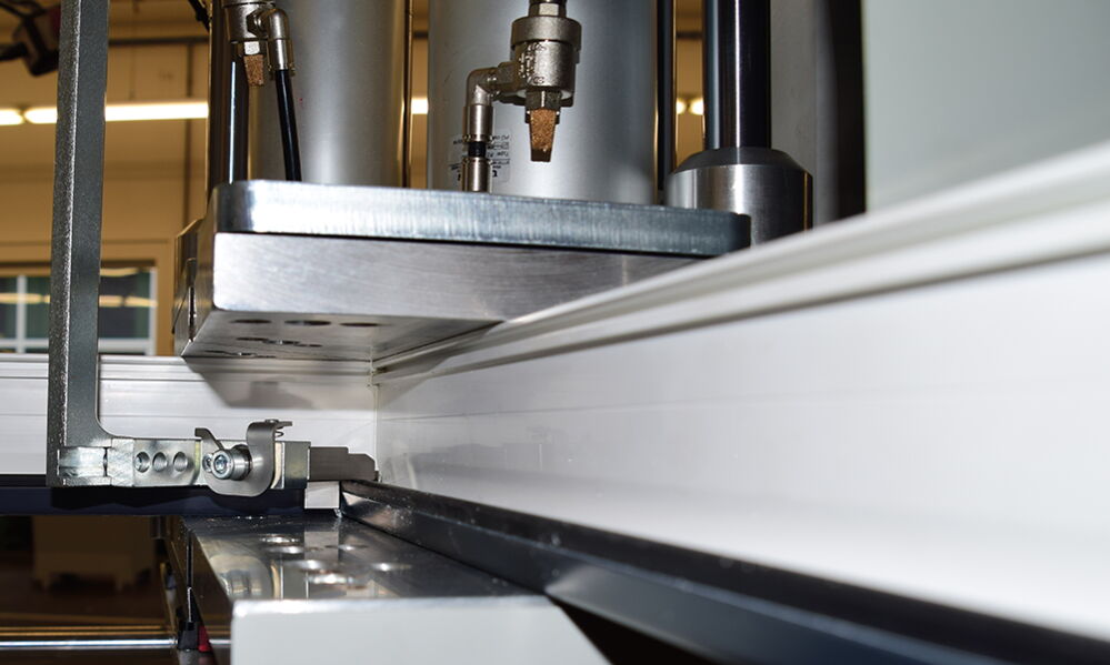 The optionally available gasket moulder respectively downholder ensures optimal machining of profiles with gasket. On the picture you can see a gasket stamp adapted to the profile.